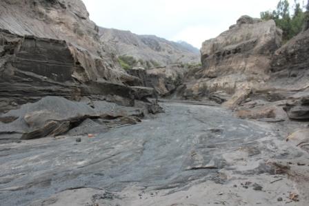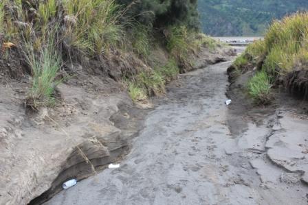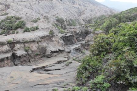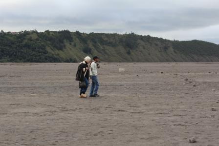 | Marijke loopt met de gids door het "maanlandschap" naar de Bromo vulkaan | Overal zie je diepe geulen, waarschijnlijk ontstaan tijdens de laatste uitbarsting van de Bormo | Hier en daar hebben zich prachtige tuintjes gevormd |