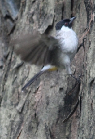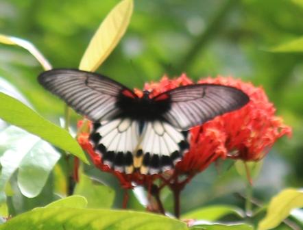 | We ontbeten in het huis van de jeepchauffeur en zagen daar deze mooie vlinder in de tuin | een fladderende roetkop buulbuul met gele stuit | een zebraduifje | en een enorme spin, de zilveren toekijo |