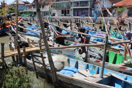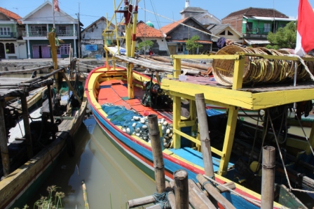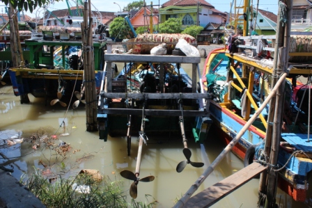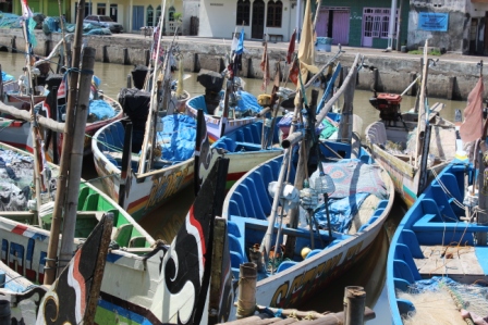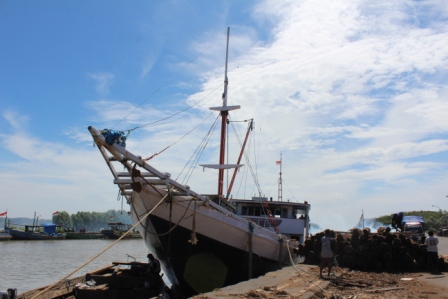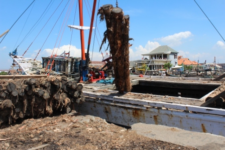 | het hout wordt uit het schip getakeld, op de wal gelegd, bestemd voor een tegenover liggende zagerij | de kleine schepen van de Pasuruaanse vissersvloot zijn prachtig gekleurd n hebben traditionele decoraties, ze vissen met staand want | |