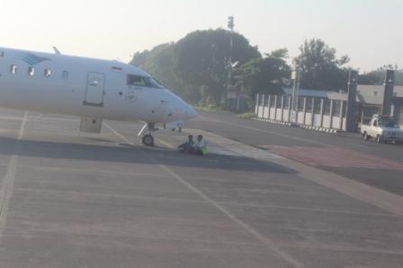 | Het Garuda vliegtuig met een uurtje vertraging | het personeel is er maar bij gaan zitten | we mogen weg van de verkeersleiding |
