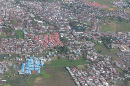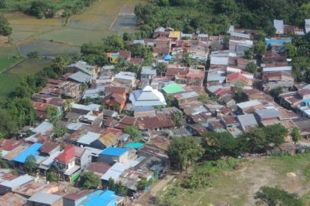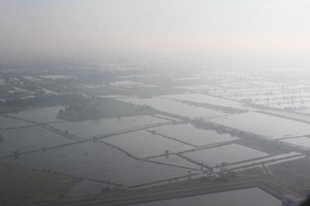 | over een viskwekerij, we zullen er nog veel zien maar niet zo'n grote | woonwijk rond een moskee, veel huizen met golfplaten daken | en we landen op Ujung Pandang, de oude naam van Makassar |