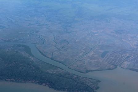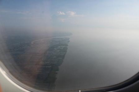| 4 minuten later zien we toch weer een stukje Java, het is de kust van het eiland Madura, we vliegen dus over de Madura straat | |