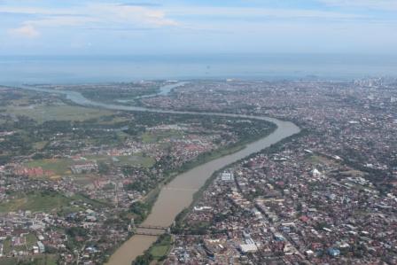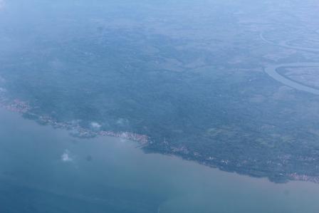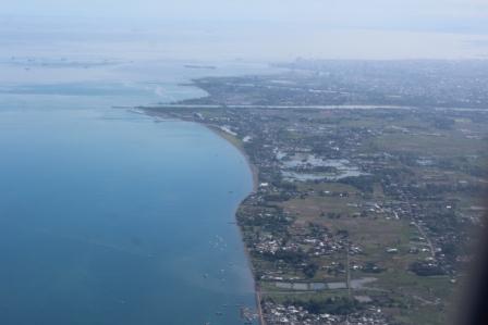 | dan mogen we verder en zien de kust van Sulawesi, vroeger Celebes | met daarachter de stad Makassar in tweeën gespleten door de Tallo rivier | |