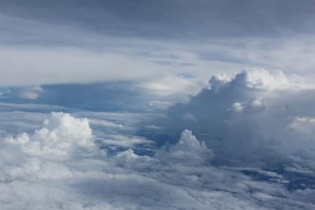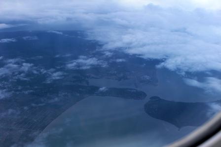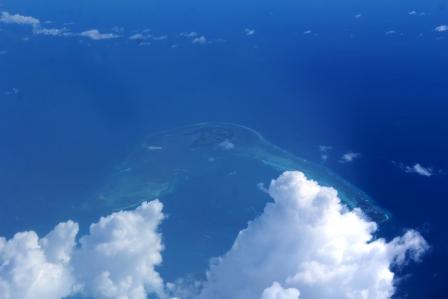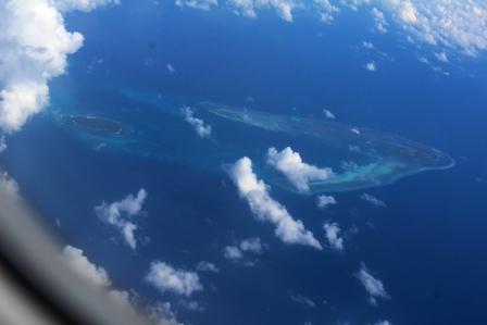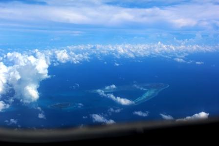 | 7 minuten daarna weer wat eilandjes maar dan komt de bewolking opzetten | het lijkt nu net alsof we over Alaska vliegen | weer 27 minuten later een vaag eiland - een koraalrif? |