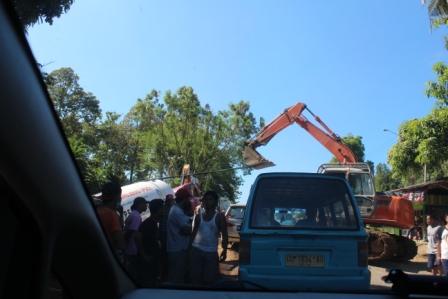 tweede de greppel onder de tankauto met zand vulde. De weg was