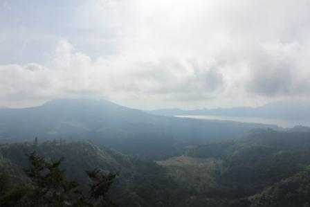 | op de helling van deze vulkaan zou de mountainbike-tocht starten | vanwege de mist werd gekozen voor een ander startpunt | over de lokale, vaak smalle wegen |