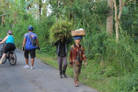 | één van de vlechtende dames | dan weer verder langs de rijstvelden | door het volgende dorp |