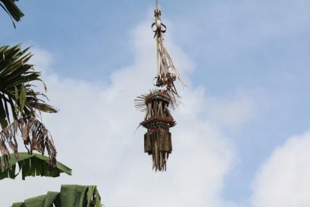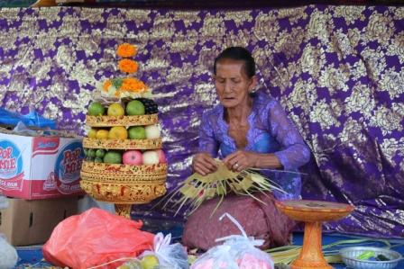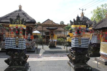 | als een tempel was vernieuwd werd er een stroboog aan de weg gezet met prachtige versieringen | in Desa Keliki werden de stro-versieringen door een groepje vrouwen gemaakt | |