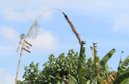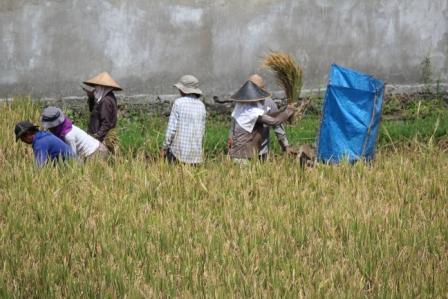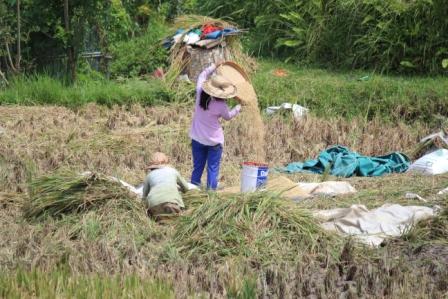 | op veel akkers onderweg werd rijst geoogst en gedorst | we zagen een vogelverschrikker met een door de wind aangedreven ratel | |