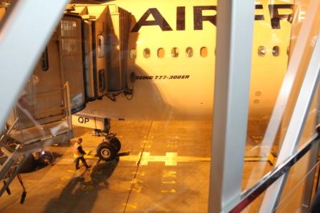 | aan de terminal van Charles de Gaulle in Parijs | ons vliegtuig, een Boeing, wordt gereed gemaakt | bijtanken of het vuile water lozen? |