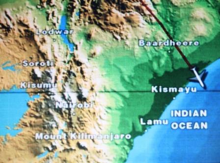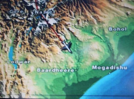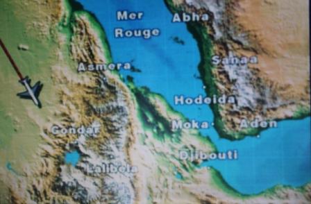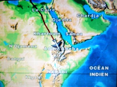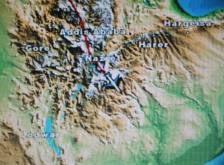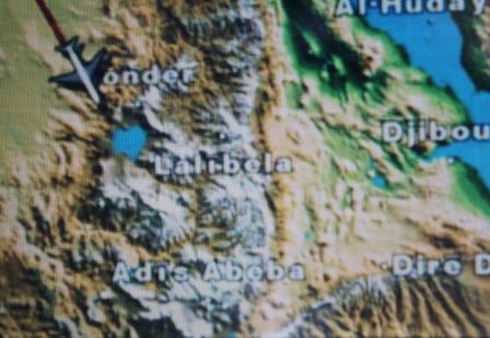 | Na Egypte vlogen we over Soedan en Ethiopië | boven Soedan zien we een vliegveld | Weer bekende plaatsen van onze Ethiopië-reis als Gondar, Lalibela en Addis Abeba |