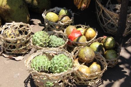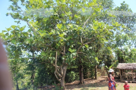 | op straat worden vruchten verkocht die hier ook in de bomen te zien zijn | Jackfruit of zuurzak | de Jackfruitboom |
