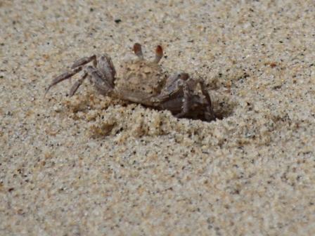op het strand zag je overal gaten waar een spookkrab z'n kop uitstak. Als we te dicht bij kwamen schoten ze in hun holletje |