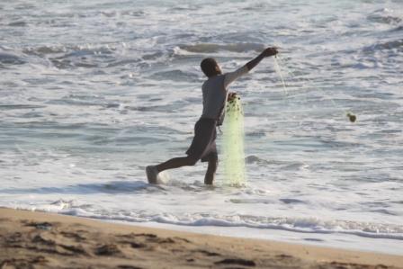 | eenzame visser gooit zijn net uit | het strand om 6 uur 's morgens | vissersdorpje van Mananjary |