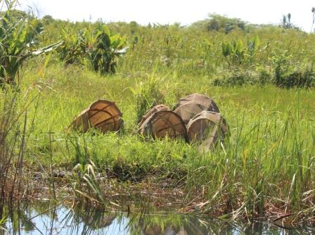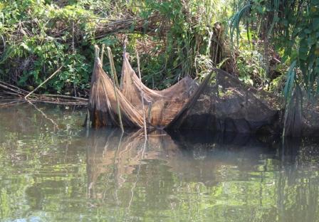 | een lokale visser in een holle boomstam | fuiken te drogen | kubben |