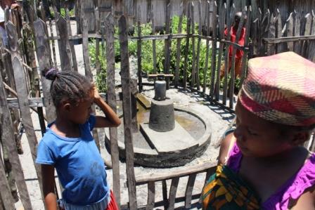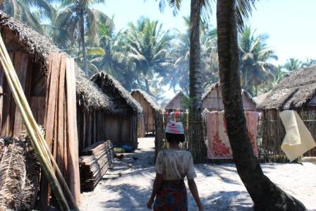 | de fuiken (wel van nylon!) hangen te drogen | we liepen door het dorpje tussen de dicht opeen staande hutten door | in het dorp waren door de overheid 9 waterpompen aangelegd |
