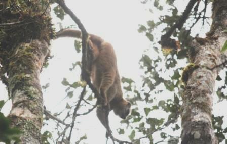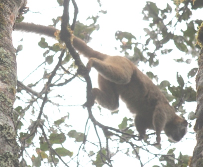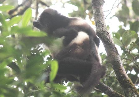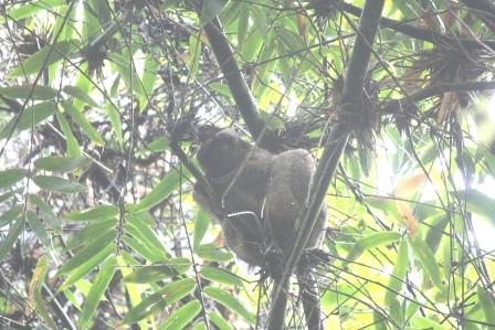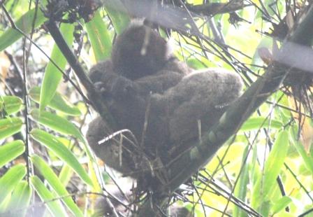 | met regenjassen aan strompelen we door het woud | en de spotters vinden al snel enkele greater bamboe lemuren in de boomkruinen | |