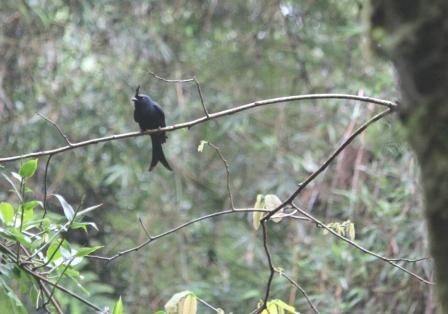 | een kuifdrongo vraagt zich af waar wij mee bezig zijn | dan zien we een diadeem sifaka (Propithecus diadema), een lemurensoort | ook spinnen zijn rijkelijk vertegenwoordigd in het regenwoud |