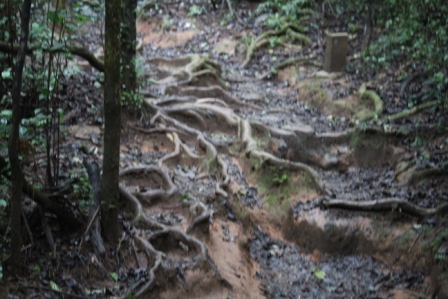 weer terug op het pad dat loopt over gladde boomwortels en glibberige stenen |