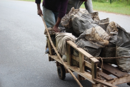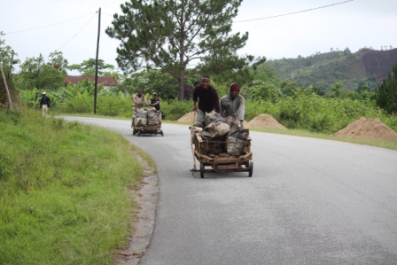 | we worden ingehaald door het kleinschalige transport dat de dorpelingen als vervoermiddel gebruiken, ze hebben een stok om één voorwiel te sturen | boven het riviertje langs de weg zien we een holenkiekendief vliegen | |