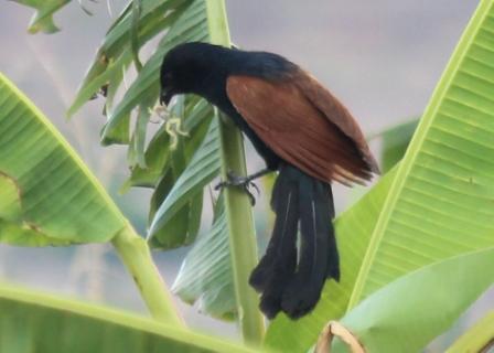 en verzorgen we het bloedzuigerwondje Marijke had die ochtend een grote vogel met lange staart, de toeloespoor koekoek of Madagaskar Coucal, gefilmd. Hij maakt een enorm lawaai dat beantwoord wordt door andere gelijksoortige vogels in de omgeving. Na de lunch maken we samen een wandeling. Enkele reisgenoten hebben een grote kameleon gezien en die moeten we natuurlijk ook bekijken |