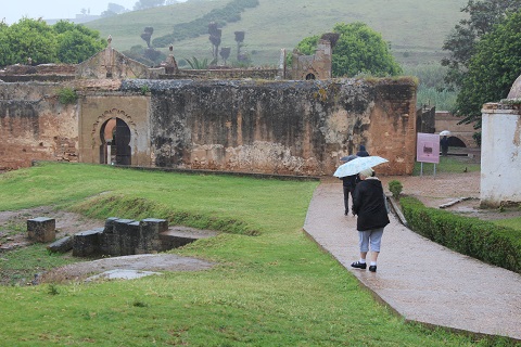 | nog steeds in de regen maar nu wel met jassen aan bekeken we de ruines | maraboets (woningen) en graven van Merindische vorsten |