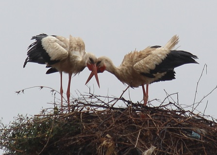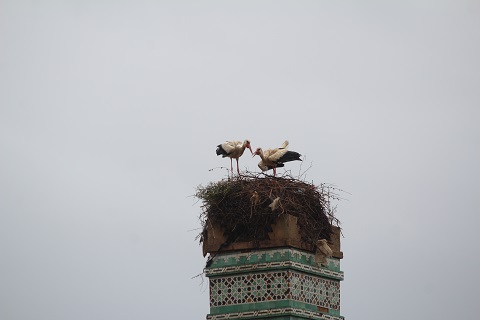| Minaret uit de 13e eeuw met bovenop een ooievaarsnest | twee baltsende ooievaars gaan hier hun gezin stichten | |