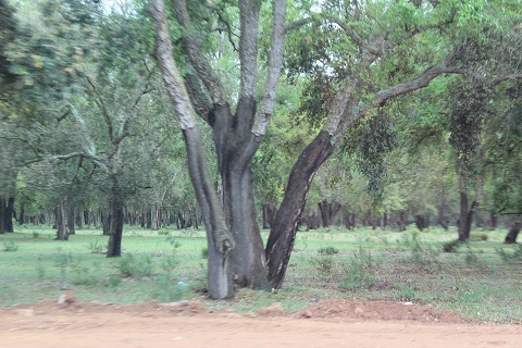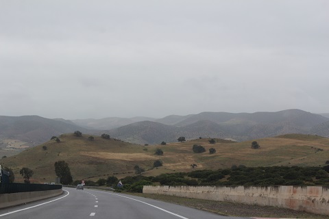 | we rijden door de midden Atlas naar Meknès | onderweg een bos met deels ontbaste kurkeiken | en veel olijfboomgaarden |