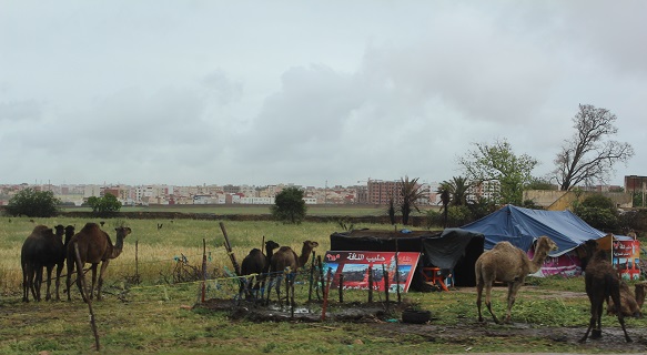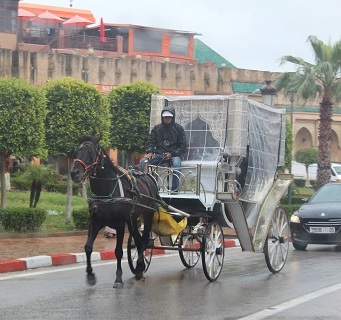 | we passeren een dromedaris-stalling | en komen bij de Medina van Meknès, het regent nog steeds | zelfs de koetsjes hebben een regenpak aan |
