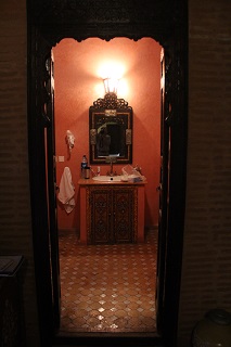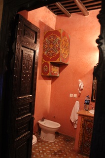 | eindelijk na een lange natte reisdag op onze kamer | een wastafel | een bad | en een toilet (achter de deur) |