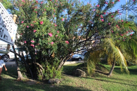 | De natuur even buiten Cancún | met overal palmen | en veel bloemen langs de weg |