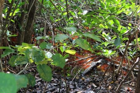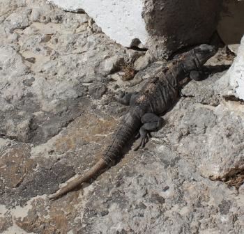| Onze eerste leguaan, er volgden die dag nog tientallen | Bij Tulum liepen we een pad langs Mangrove bossen met rood water, gekleurd door de Mangrove's | Ons
