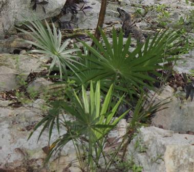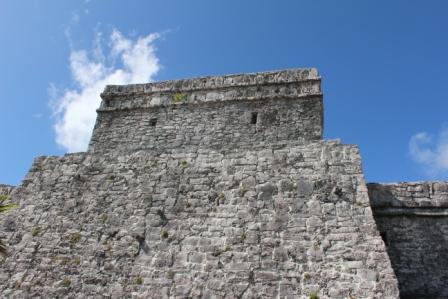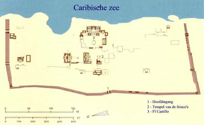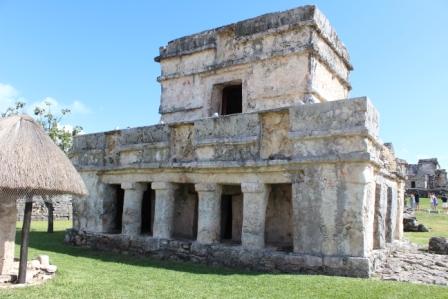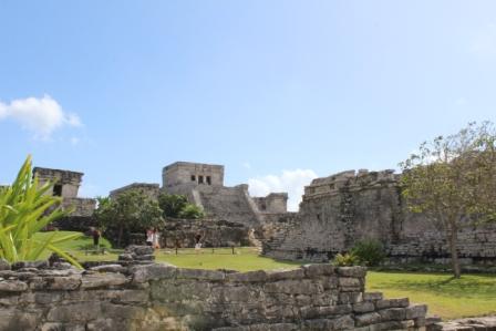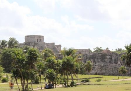 | Het Tulum complex met links het hoofdgebouw El Castillum | Leguanen zijn gek op de bloemen van de Hibiscus | Nog meer Tulum Maya gebouwen |