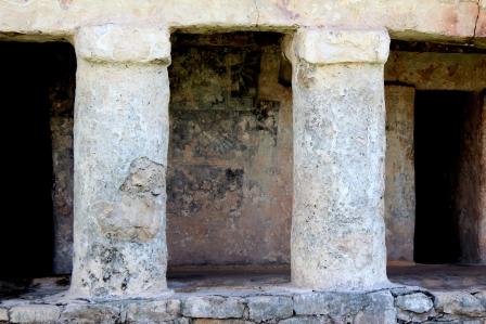 | Wel speciaal is de uitzonderlijke ligging aan zee. Het interessantste bouwwerk is de Tempel van de Fresco's, met zijn voorportaal met vijf openingen met vier grote zuilen. Achter de ingang waarop beelden van een 'neerdalende god' staan, bevindt zich een overwelfd vertrek met schilderingen die op de gewelven zijn aangebracht. | Zo zag
