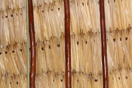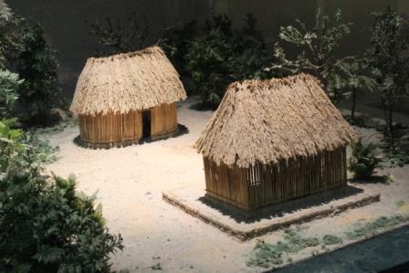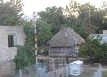 | In de dorpjes stonden nog veel (bewoonde) oude Maya huisjes | dezelfde huisjes als maquette in het museum | Het dak van palmbladeren |