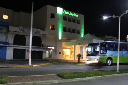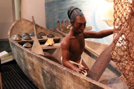 | Een Maya visser in een uitgeholde boomstam | Maquette van de Tulum Maya stad | Onze bus voor het hotel in Chetumal |