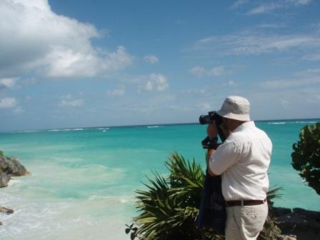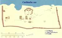 | In het castellum werd 's nachts een vuur aangestoken dat door een opening in een muur scheen en diende als een soort vuurtoren. Hierdoor konden de zeelieden tussen de riffen doornavigeren | Voor de kust ligt een kilometers lang koraalrif waarvan de plaats gemarkeerd wordt door de witte golfkoppen. Pal voor het Castellum van de Mayastad is dat rif onderbroken (geen branding) en alleen daar kunnen de schepen naar de kust varen | De fotograaf en de oceaan op de foto gezet (speciaal voor Saskia) |