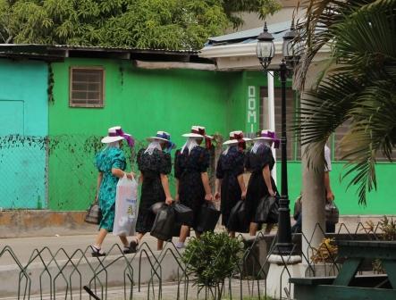 bevolking. Ook in Belize zijn een aantal nederzettingen van de Mennonieten, waarvan een groep in Orange Walk aan het winkelen was. |