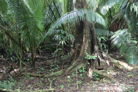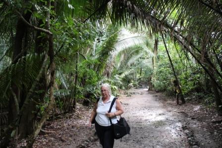 | Marijke in het tropisch regenwoud | Door de kalkstenen bodem wortelen de bommen niet diep | Op de terugweg vol gas om voor donker terug te zijn |