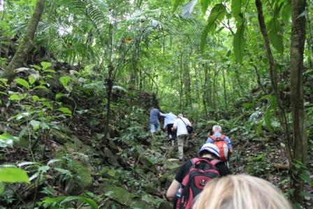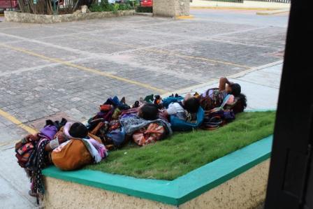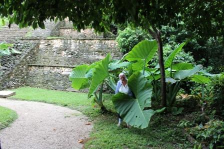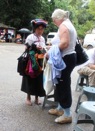 | Maya meisjes uit de bergen rusten met hun handel 's ochtends voor ons hotel | Na ontbijt en bustocht het regenwoud in | overal vind je resten van oude Maya gebouwen, 75% is nog niet opgegraven |