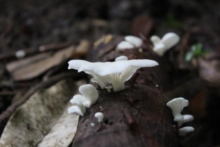 | Een vlinder met een uitstekende camouflage, de Velvetbean Caterpillar | Veel bijzondere paddenstoelen, hier een bekerzwam (Viltkelkje) | en een Denneschelpzwam op rottend hout |