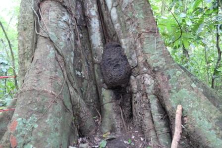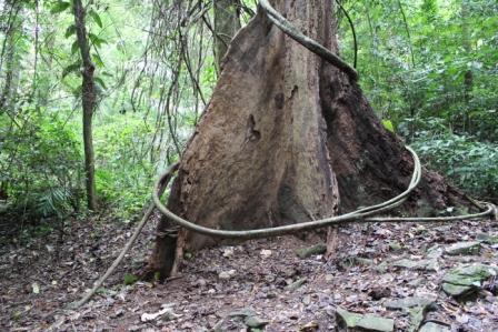 | Termietennest | in detail | Een mahonieboom met een liaan er omheen geslingerd |