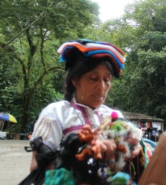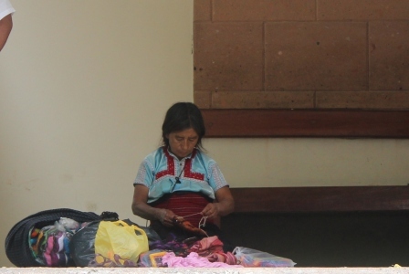 | Maya-vrouwen uit de bergen in traditionele kleding bieden zelf geweven stoffen en sieraden aan | ||