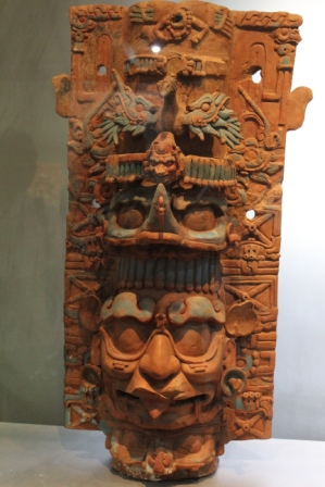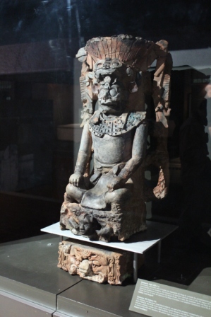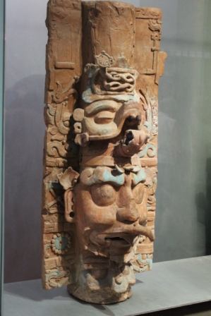 | De Maya koningen lieten deze wierookbranders maken (gemaakt uit één stuk), die verhalen over de gebeurtenissen uit hun leven. Bovenop stond een vat met wierrook. De nieuwe koning vernietigde alle kunstvoorwerpen van zijn voorganger, zodat er maar weinig van deze dingen bewaard zijn gebleven, alleen uit de latere periode omdat die begraven werden (uit voorzorg?) onder de vloer van het paleis. | Een Maya beeldje | |||