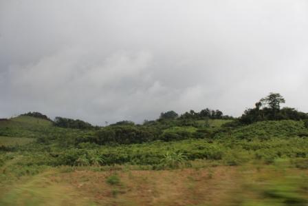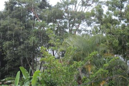 | Een oude Mahonie met dikke lianen | Door het water | Een rubber boom met inkervingen van het aftappen |
