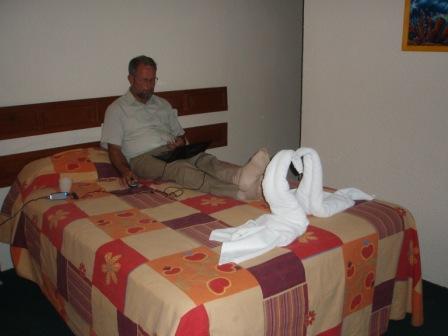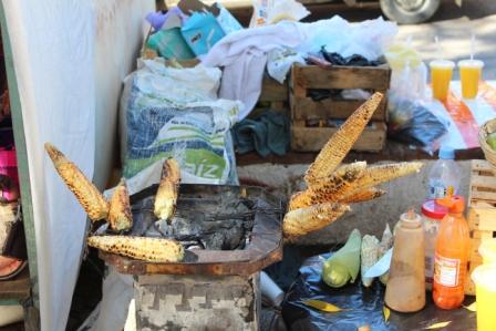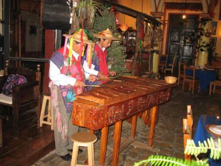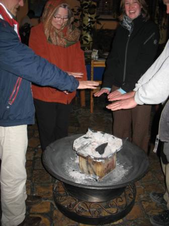 | Opwarmen bij een houtskoolvuurtje | onder begeleiding van twee lokale xilofonisten | met het clubje aan tafel |