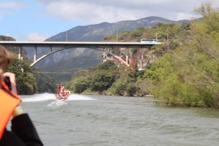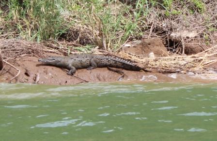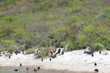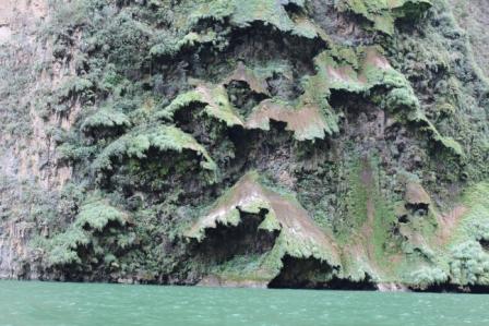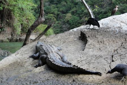 van de energie van Centraal-Amerika wordt opgewekt. Tussen spectaculaire hoge rotsen waarin ook enkele grotten zijn; de rotsen zijn gemiddeld 1000 meter hoog en het water ruim 100 m diep. De Canyon is miljoenen jaren geleden uitgesleten door de woeste Río Grijalva, die in 1982 getempt is door de aanleg van de Chicoasen-dam. We zien veel zwarte gieren, aalscholvers, 2 soorten reigers, leguanen en krokodillen. De kloof is werkelijk prachtig en op het eind komen we bij de “kerstboom-waterval”, een mooi gezicht. In het droge seizoen komen geen grote hoeveelheden water naar beneden en daardoor is ie helemaal begroeid, en dankt er zijn naam ‘Arbol de Navidad’ aan. |