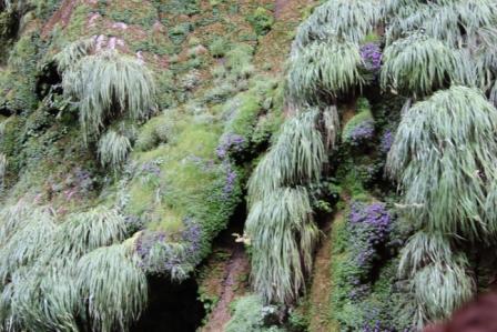 | Op het eind komen we bij de “kerstboom-waterval”, een mooi gezicht. In het droge seizoen komt er maar weinig water naar beneden en daardoor is ie helemaal begroeid, en dankt er zijn naam ‘Arbol de Navidad’ aan. | ||