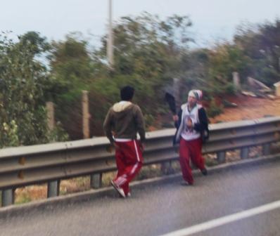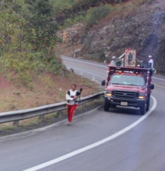 De hele dag kwamen we pelgrim-fakkellopers met de begeleidingsauto's tegen, met luide muziek en loeiende sirenes, alles ter ere van de Maagd de Guadelupe |