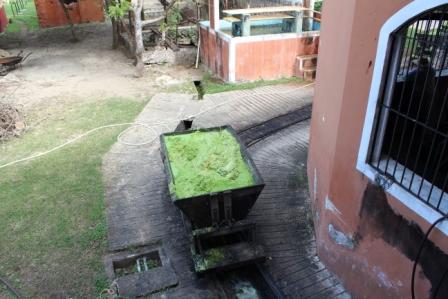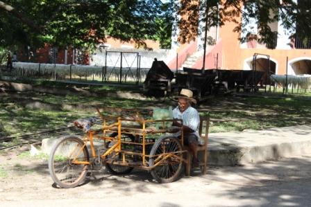 We gingen verder naar de agave-velden op een open wagen over een smalspoor, getrokken door een muilezel (vlinder). Een lokale Maya-boer geeft uitleg over de lokale levensstijl van de plantagewerkers en het planten van de agave.